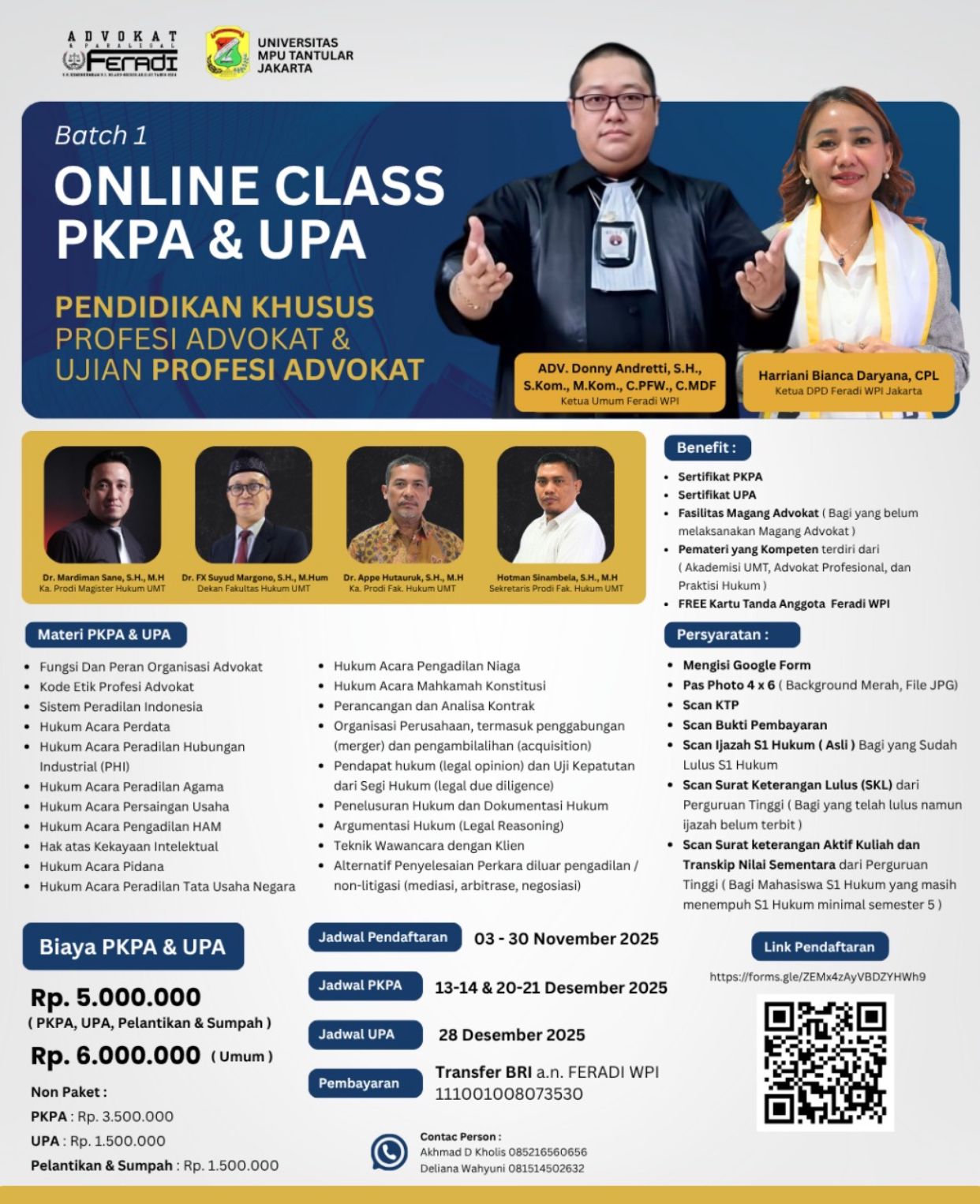 Jakarta, Releasindo.com — Dalam upaya memperkuat kapasitas hukum dan meningkatkan profesionalisme calon advokat di Indonesia, FERADI WPI bekerja sama dengan Universitas Mpu Tantular Jakarta membuka pendaftaran Batch 1 Online Class Pendidikan Khusus Profesi Advokat (PKPA) dan Ujian Profesi Advokat (UPA).
