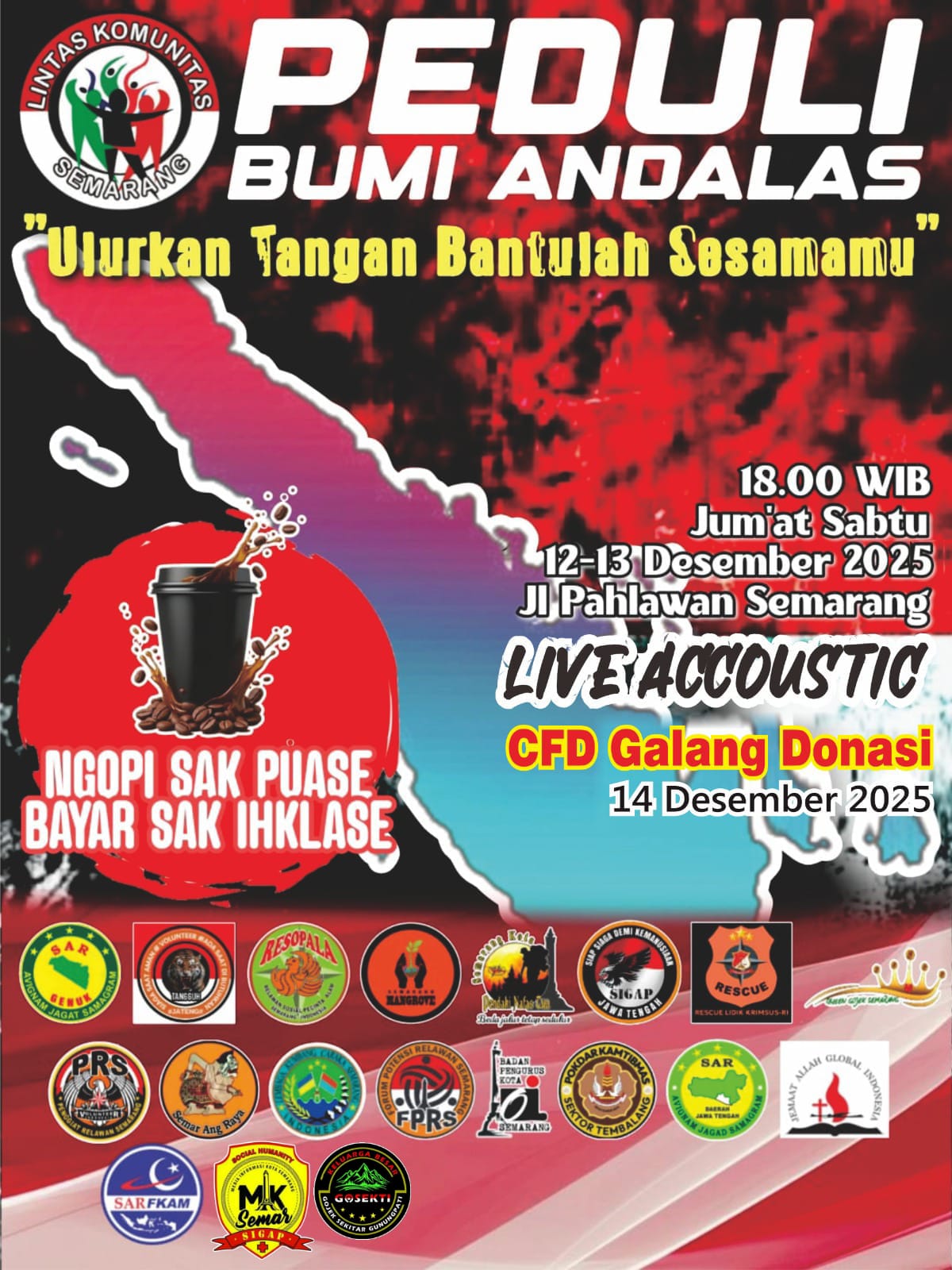 ​”Ini adalah panggilan kemanusiaan. Kami mengajak seluruh warga Semarang untuk berpartisipasi, menikmati kopi, mendengarkan musik, dan yang terpenting, berbagi keikhlasan untuk saudara-saudara kita di Sumatera,” ujar perwakilan Lintas Komunitas Semarang.
